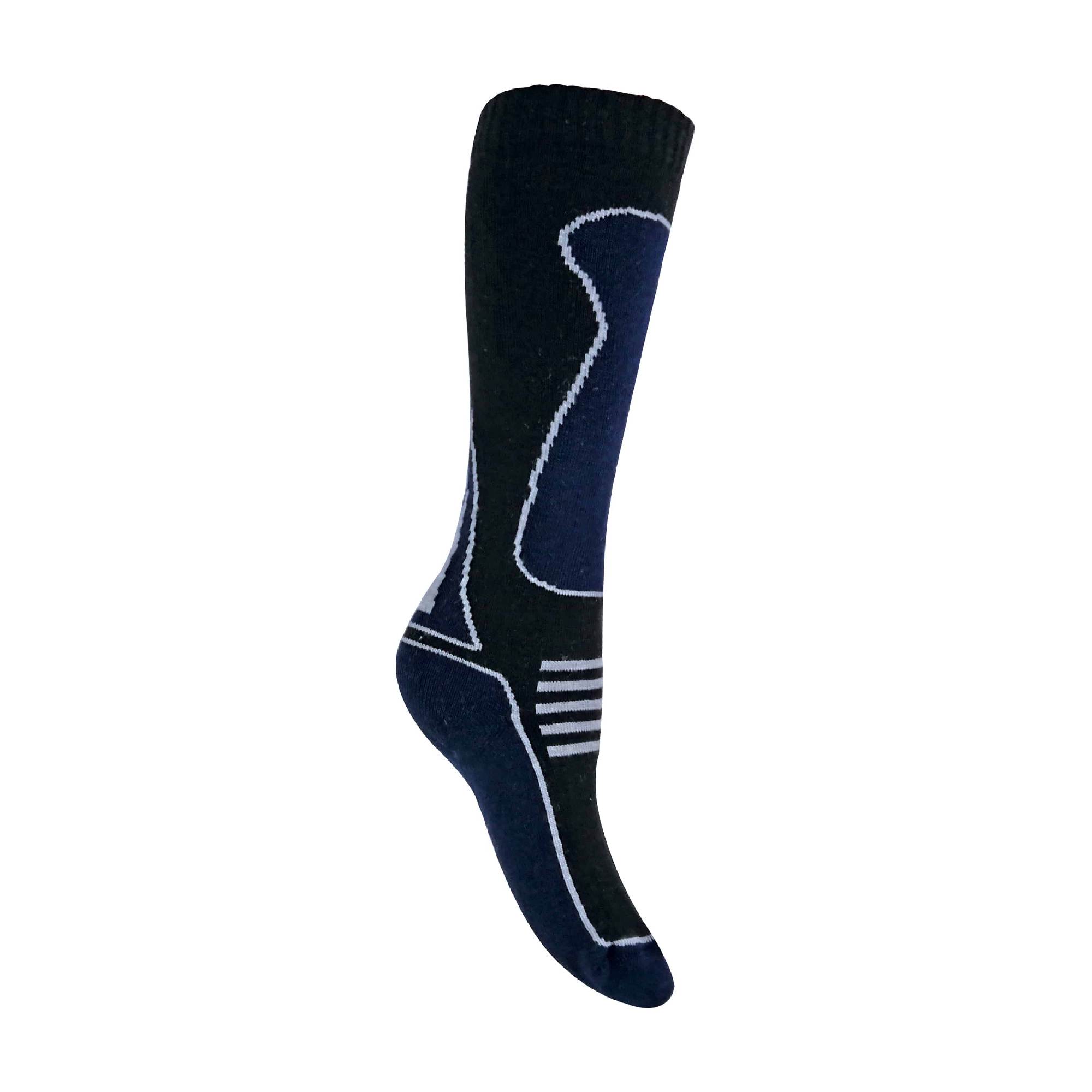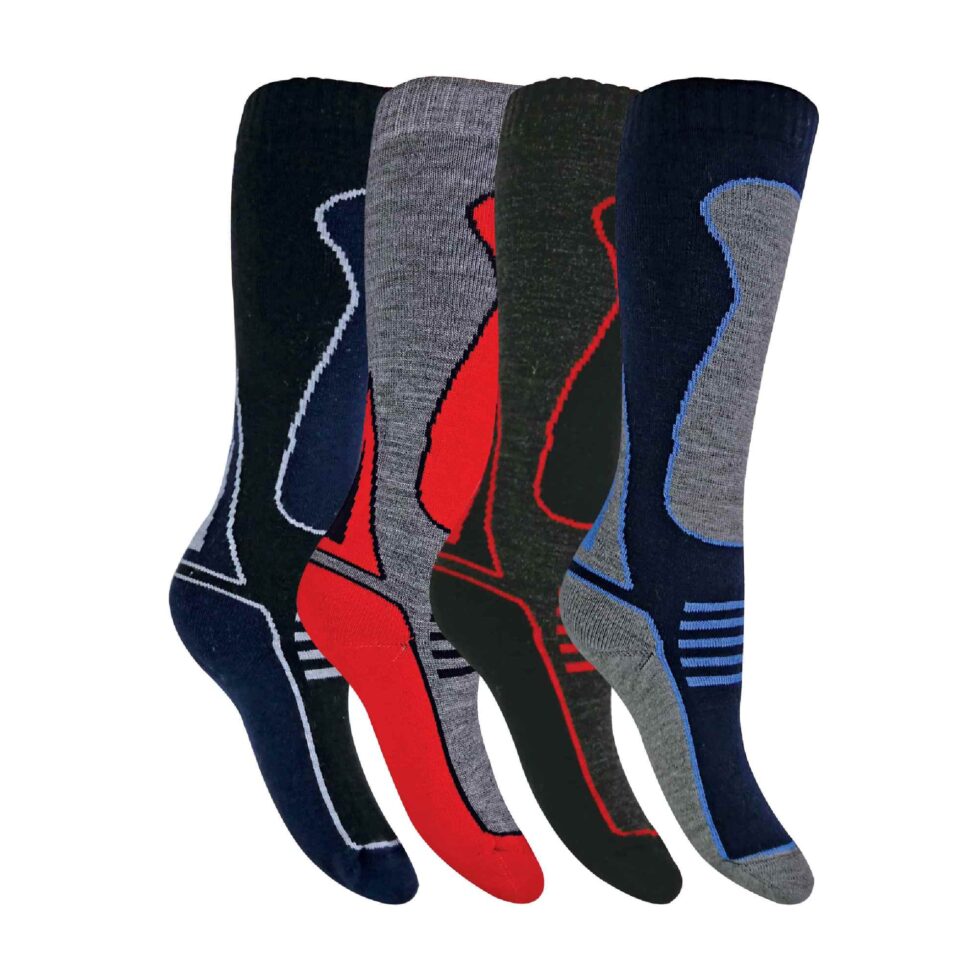 This 4 pair pack of boys ski socks are available in 2 different sizes and come in an assorted pack that includes the colours red, blue and black. They are machine washable and have a high wool content to keep the cold out.