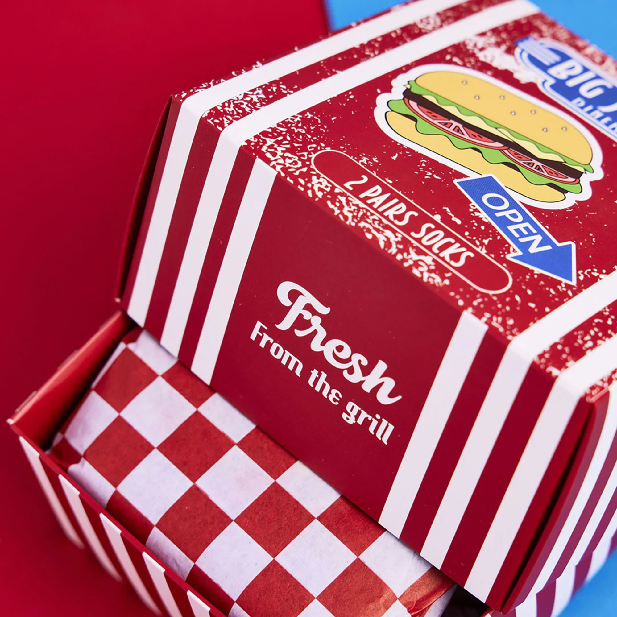 These socks are different to a regular pair as they come in a great gift box designed like a classic burger box! One pair is classic burgers and one is tasty fries! An ideal gift that adds a bit more funkyness to gift giving.