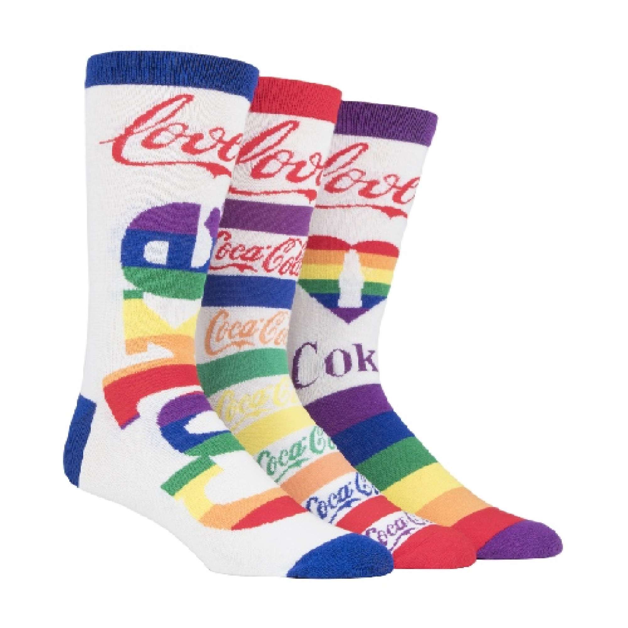 In this 3 pair pack, you will receive 1 pair of rainbow striped socks with a heart design on the leg, 1 pair of rainbow striped and rainbow coloured Coca Cola logo socks, and 1 pair of the word Coke in a rainbow colour printed across the front of the socks.