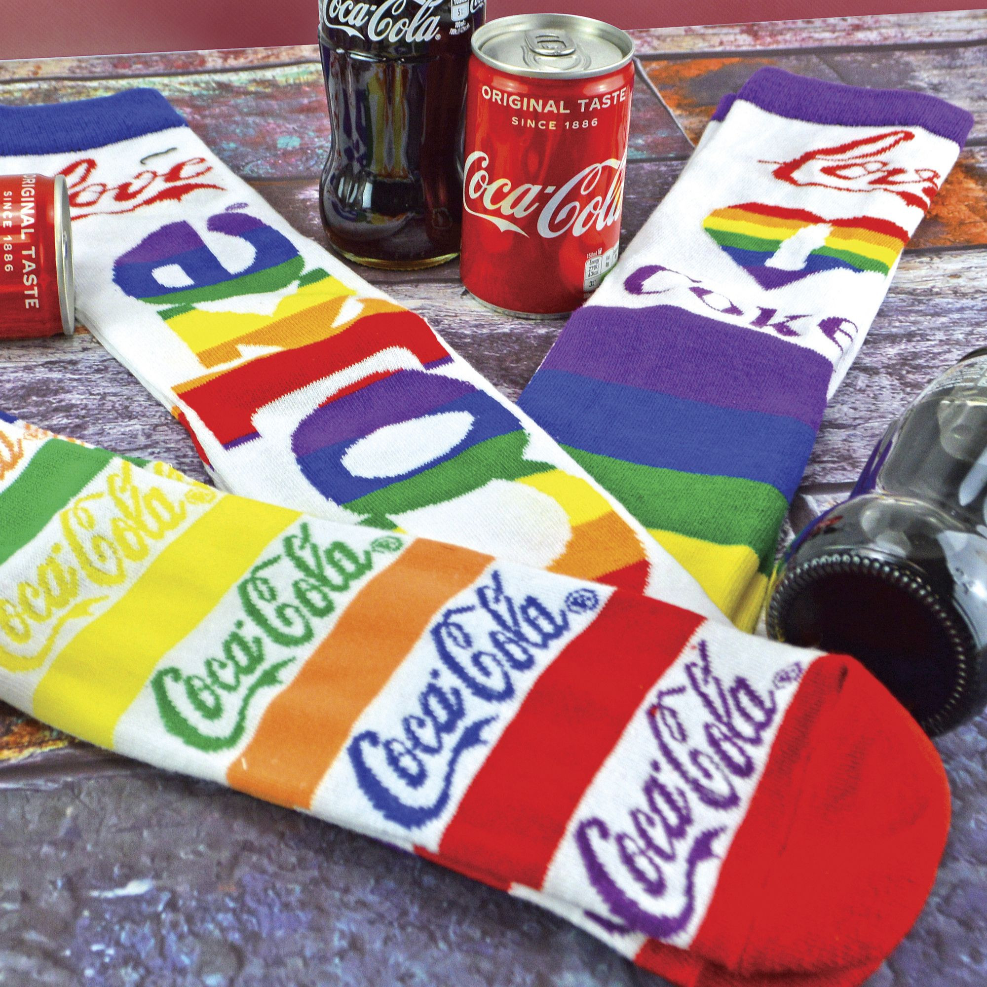 These Coca Cola socks are now available in a colourful rainbow heart design. No sock is the same with these creative designs!
