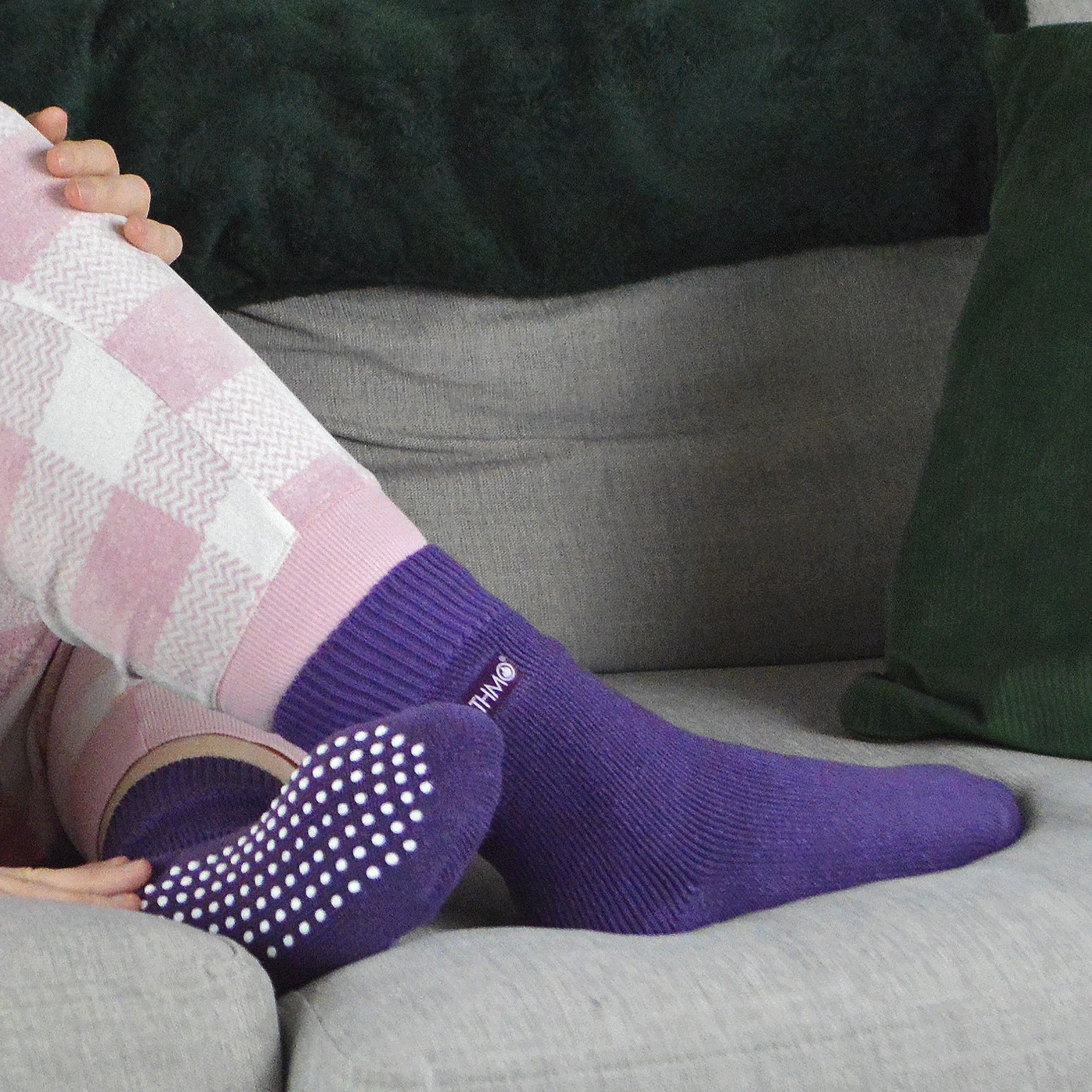 This is the THMO slipper socks version of the thermal socks. An anti slip grip has been designed onto the foot of the ladies slipper socks in order to prevent you from slipping on surfaces such as hard wooden floors or kitchen tiles. It is a simple but effective dotted design on the foot of the ladies slipper socks. This is very handy if you are using our thermal ladies slipper socks to lounge around the house instead of going outdoors and using them for walking and hiking.